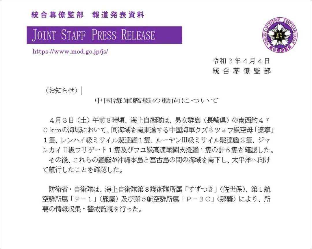 日本防卫省统合幕僚监部4月4日通报,日本海上自卫队于周六(4月3日)上午8时左右,在日本长崎县男女群岛西南方向470公里海域处,发现包括辽宁舰在内的6艘中国人民解放军海军军舰,日本自卫队随后出动军机,航拍了中国航母编队。