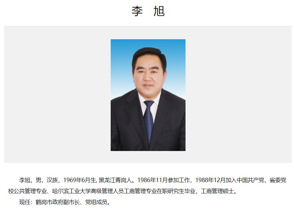 据鹤岗市政府网站显示:李旭,男,汉族,1969年6月生, 现任鹤岗市政府副市长、党组成员。