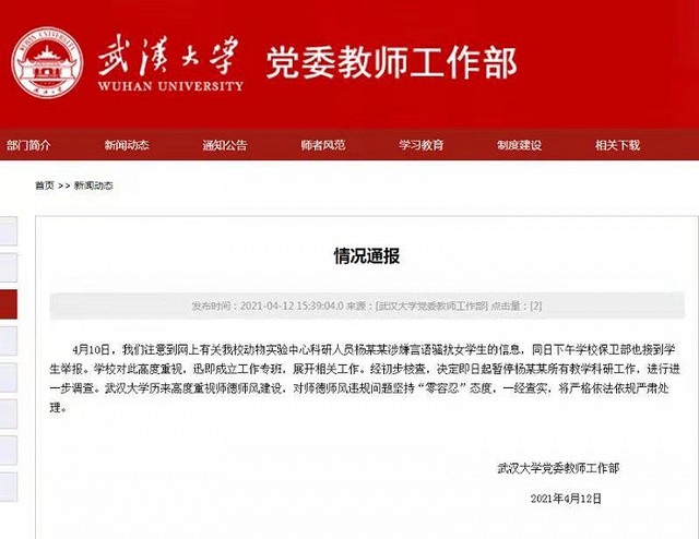 武汉大学党委教师工作部4月12日发布通报,4月10日,注意到网上有关武汉大学动物实验中心科研人员杨某某涉嫌言语骚扰女学生的信息,同日下午学校保卫部也接到学生举报。学校对此高度重视,迅即成立工作专班,展开相关工作。经初步核查,决定即日起暂停杨某某所有教学科研工作,进行进一步调查。武汉大学历来高度重视师德师风建设,对师德师风违规问题坚持“零容忍”态度,一经查实,将严格依法依规严肃处理。