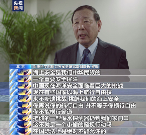 军事科学院原世界军事研究部副部长罗援表示:海上安全是我们中华民族的一个重要安全屏障,中国现在海洋安全面临着巨大的挑战,有些国家以海上航行自由权来不断地挑战、挑衅我们的海上安全。你再说你的航行自由,并不等于你横行自由,你不能横行霸道。把你的一些深水探测器扔到我们家门口,这不就是一个小偷的窥视行动吗?在国际法上是绝对不能允许的。所以说现在为了国家的安全,我们必须要加强海洋安全屏障的建设。(总台央视记者 王莉 赵迎晨 范月鸣)