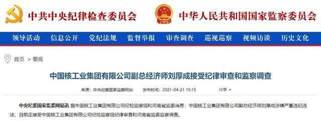 中国经济周刊-经济网讯 4月21日,据中央纪委国家监委网站消息,中国核工业集团有限公司副总经济师刘厚成涉嫌严重违纪违法,目前正接受中国核工业集团有限公司纪检监察组纪律审查和河南省监委监察调查。