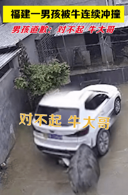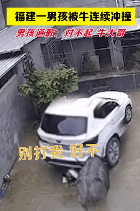 原标题:男孩被疯牛袭击躲车底求饶:对不起牛大哥 现场画面曝光
