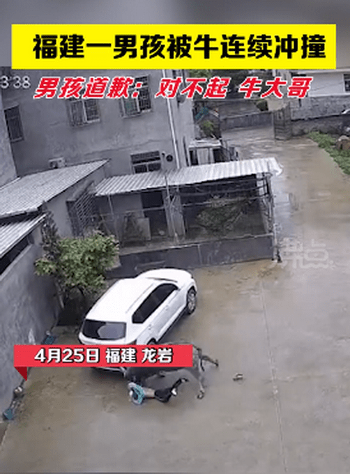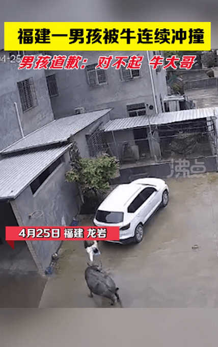 4月25日,福建龙岩,一男孩被牛追击连续冲撞,男孩躲在车下连连道歉,对不起,牛大哥,别打我好不。随后,牛转身离开,男孩万幸逃过一劫。