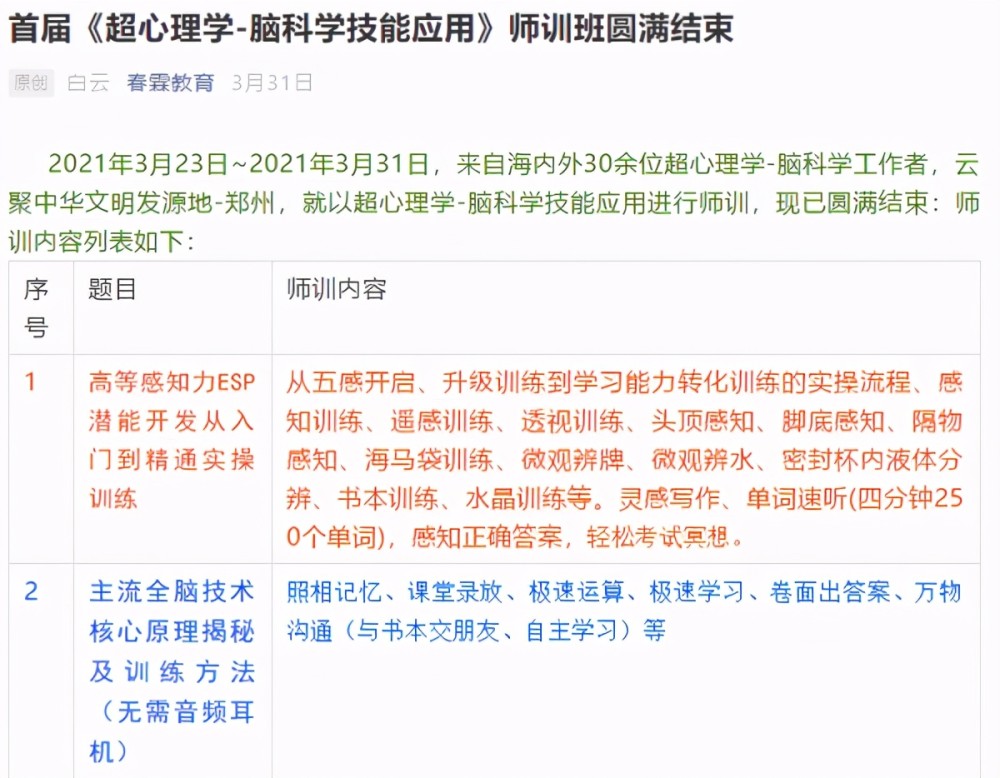 据公开报道显示,郑州市春霖职业培训学校,主要培训婚姻家庭咨询师、心理咨询师、企业人力资源管理师、公共营养师、家庭教育指导师、育婴师等国家新兴职业,开办过《超心理学-脑科学技能应用》师训班等教育培训。