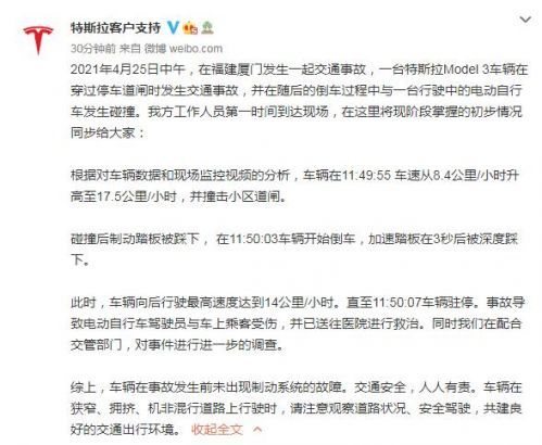 厦门特斯拉倒车撞电动车致4伤真相 特斯拉官方回应:事故前未出现制动故障