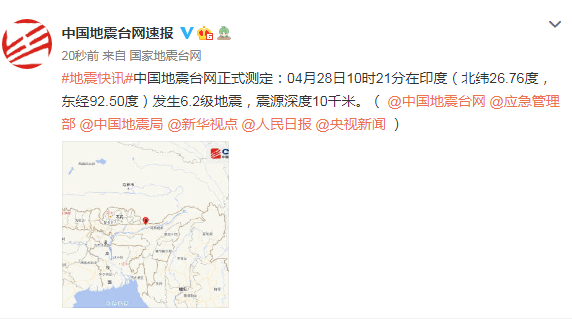 中国地震台网正式测定:04月28日10时21分在印度(北纬26.76度,东经92.50度)发生6.2级地震,震源深度10千米。