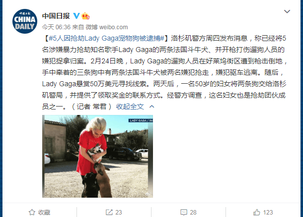 原标题:5人因抢劫Lady Gaga宠物狗被逮捕