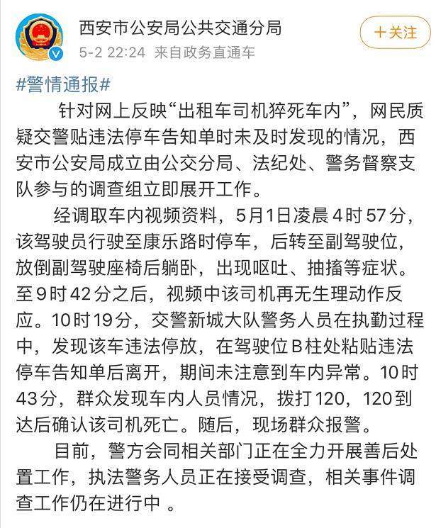 针对网上反映"出租车司机猝死车内",网民质疑交警贴违法停车告知单时未及时发现的情况,西安市公安局成立由公交分局、法纪处、警务督察支队参与的调查组立即展开工作。