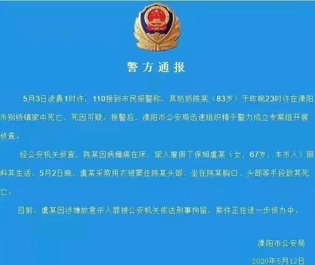 5月12日,溧阳市公安局发布通报,67岁的保姆虞某采用衣被蒙头、坐在死者胸口、头部等手段,导致对方死亡,现已被刑事拘留。