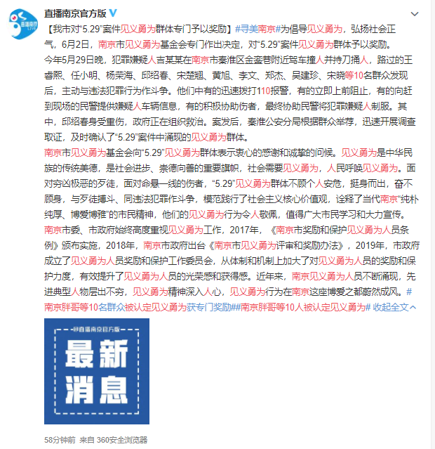 在这件事里,我们看到了凶手的残忍和恶行,也看到了多名南京市民在凶手施暴的时挺身而出、见义勇为,特别是那位见义勇为的胖哥,在危难时刻不顾自己安危挺身而出,被连捅数刀,现在都还在抢救,希望他能挺住平安度过本次难关,早日康复。