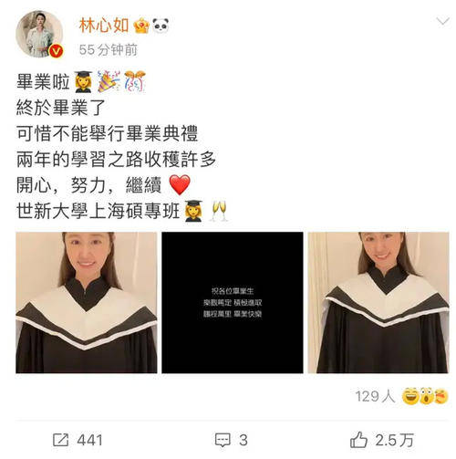 此前,林心如为了学业来回奔波于上海,后来疫情原因,她就在家完成了相关课程的学习,如今,林心如已顺利毕业,着实可喜可贺。