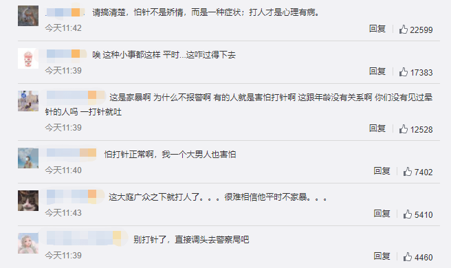 这是家暴啊 为什么不报警啊 有的人就是害怕打针啊 这跟年龄没有关系啊 你们没有见过晕针的人吗 一打针就吐