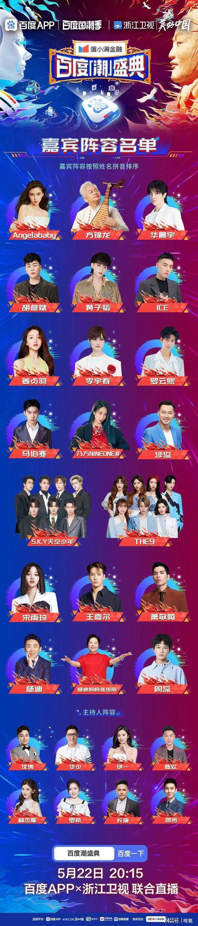 此外,百度潮盛典更有浙江卫视当家主持班子华少、沈涛、伊一、陈欢、林杰妮、罗希、长庚、贺传等8位兼具实力与魅力的主持人加盟,可谓群星云集、星光熠熠。