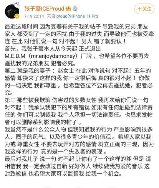 昨晚 《中国新说唱2020》选手张子豪发文道歉,“男人 错了就要认 !”并宣布退出厂牌。 承认私生活混乱,伤害了多数女性,并对自己的老婆儿子道歉。作为个旁观者 做错了就要认,法律是正义的,一切程序按照法律走。不是说发个道歉就可以原谅,被你伤害过的多数女性那算什么,该受到应有的惩罚。